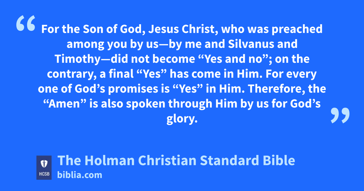 15 I planned with this confidence to come to you first, j so you could have a double benefit, k 16 and to go on to Macedonia l with your help, then come to you again from Macedonia and be given a start by you m on my journey n to Judea. o 17 So when I planned this, was I irresponsible? Or what I plan, do I plan in a purely human p q way so that I say “Yes, yes” and “No, no” simultaneously? 18 As God is faithful, r our message to you is not “Yes and no.” 19 For the Son of God, s Jesus Christ, who was preached among you by us—by me and Silvanus t u and Timothy—did not become “Yes and no”; on the contrary, a final “Yes” has come in Him. v 20 For every one of God’s promises w is “Yes” in Him. Therefore, the “* Amen” x is also spoken through Him by us for God’s glory. y 21 Now it is God who strengthens us, with you, in Christ and has anointed z us. 22 He has also sealed us and given us the Spirit as a down payment a in our hearts. b