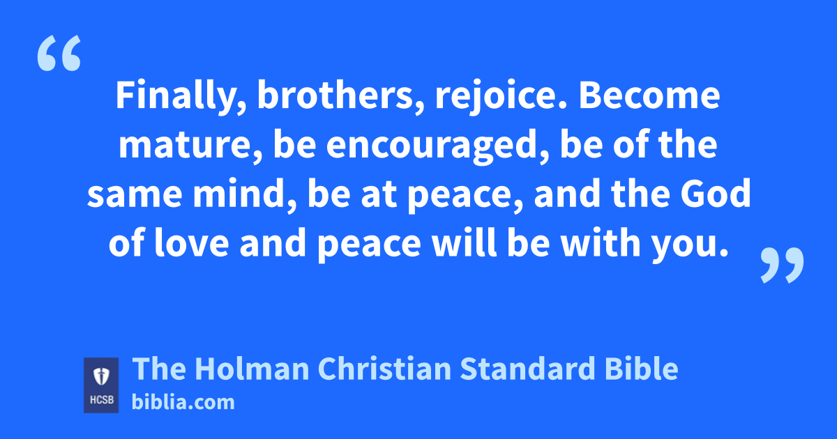 11 Finally, * brothers, rejoice. Become mature, be encouraged, be of the same mind, k be at peace, l and the God of love m and peace will be with you. 12 Greet one another with a holy kiss. n All the * saints greet you.