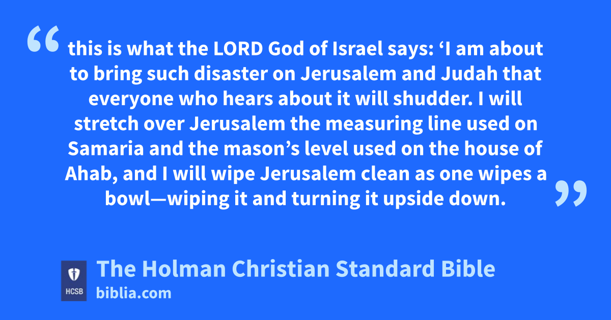 10 The Lord spoke through His servants the prophets, saying, 11 “Since Manasseh king of Judah has committed all these detestable things o—greater evil than the Amorites p who preceded him had done—and by means of his idols has also caused Judah to sin, 12 this is what the Lord God of Israel says: ‘I am about to bring such disaster on Jerusalem and Judah that everyone who hears about it will shudder. q 13 I will stretch over Jerusalem the measuring line used on Samaria and the mason’s level used on the house of Ahab, r and I will wipe s Jerusalem * clean as one wipes a bowl—wiping it and turning it upside down. 14 I will abandon the remnant t of My inheritance and hand them over to their enemies. They will become plunder and spoil to all their enemies, 15 because they have done what is evil in My sight and have provoked Me from the day their ancestors came out of Egypt until today.’ ” u