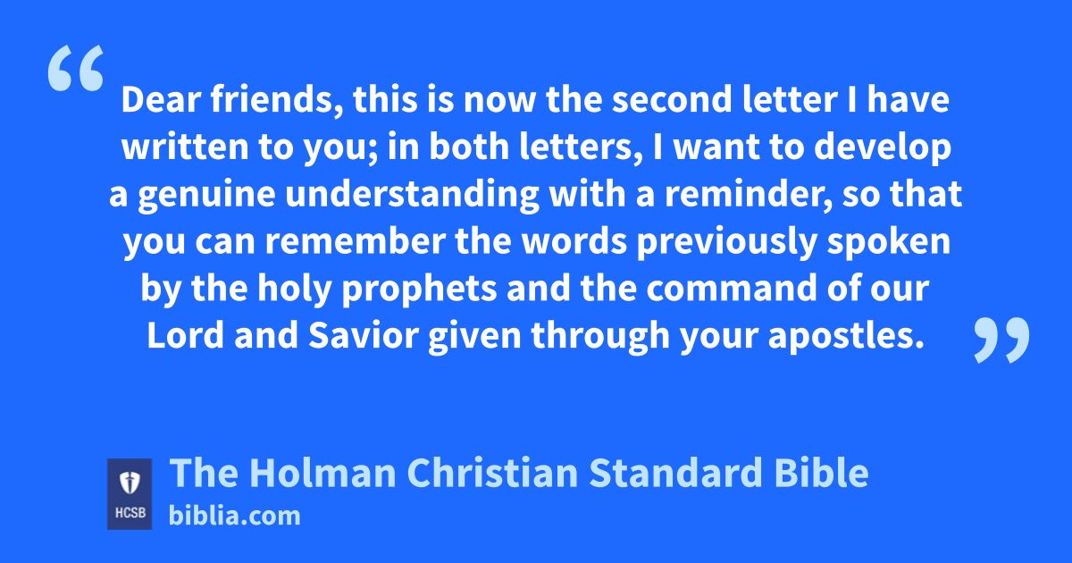 3 Dear friends, this is now the second letter d I have written to you; in both letters, I want to develop a genuine e understanding with a reminder, 2 so that you can remember the words previously spoken by the holy prophets and the command of our Lord and Savior given through your apostles. 3 First, be aware of this: Scoffers will come in the last days f to scoff, living according to their own desires, 4 saying, “Where is the promise of His coming? g Ever since the fathers fell * asleep, h all things continue as they have been since the beginning of creation.” 5 They willfully ignore this: Long ago the heavens and the earth were brought about from water and through water i by the word of God. j 6 Through these waters the world of that time perished when it was flooded. k 7 But by the same word, l the present heavens and earth are stored up for fire, being kept until the day of judgment m and destruction of ungodly men.
