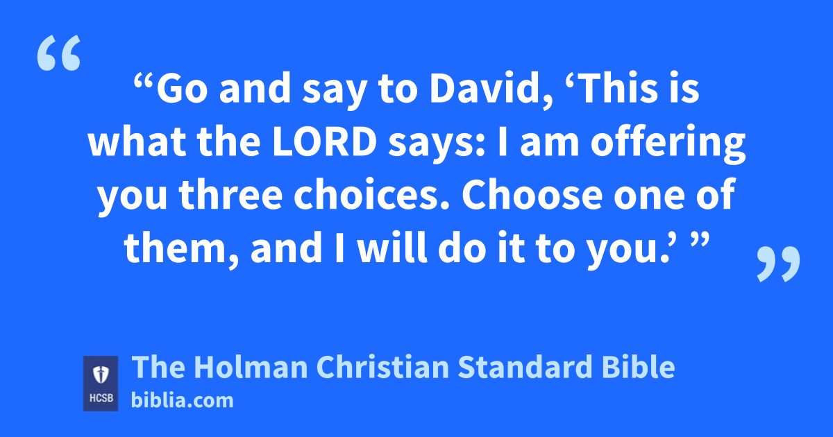 13 So Gad went to David, told him the choices, and asked him, “Do you want three n years of famine to come on your land, to flee from your foes three months while they pursue you, or to have a plague in your land three days? Now, think it over and decide what answer I should take back to the One who sent me.”