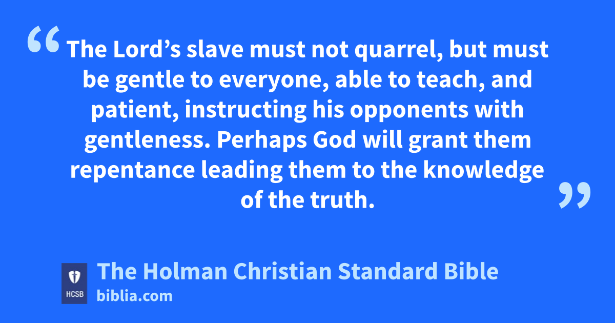 22 Flee u from youthful passions, and pursue righteousness, faith, love, and peace, v along with those who call on the Lord w from a pure heart. 23 But reject foolish and ignorant disputes, knowing that they breed quarrels. 24 The Lord’s x * slave must not quarrel, y but must be gentle to everyone, able to teach, z and patient, 25 instructing his opponents with gentleness. a Perhaps God will grant them repentance b leading them to the knowledge of the truth. 26 Then they may come to their senses and escape the Devil’s trap, c having been captured by him to do his will. d