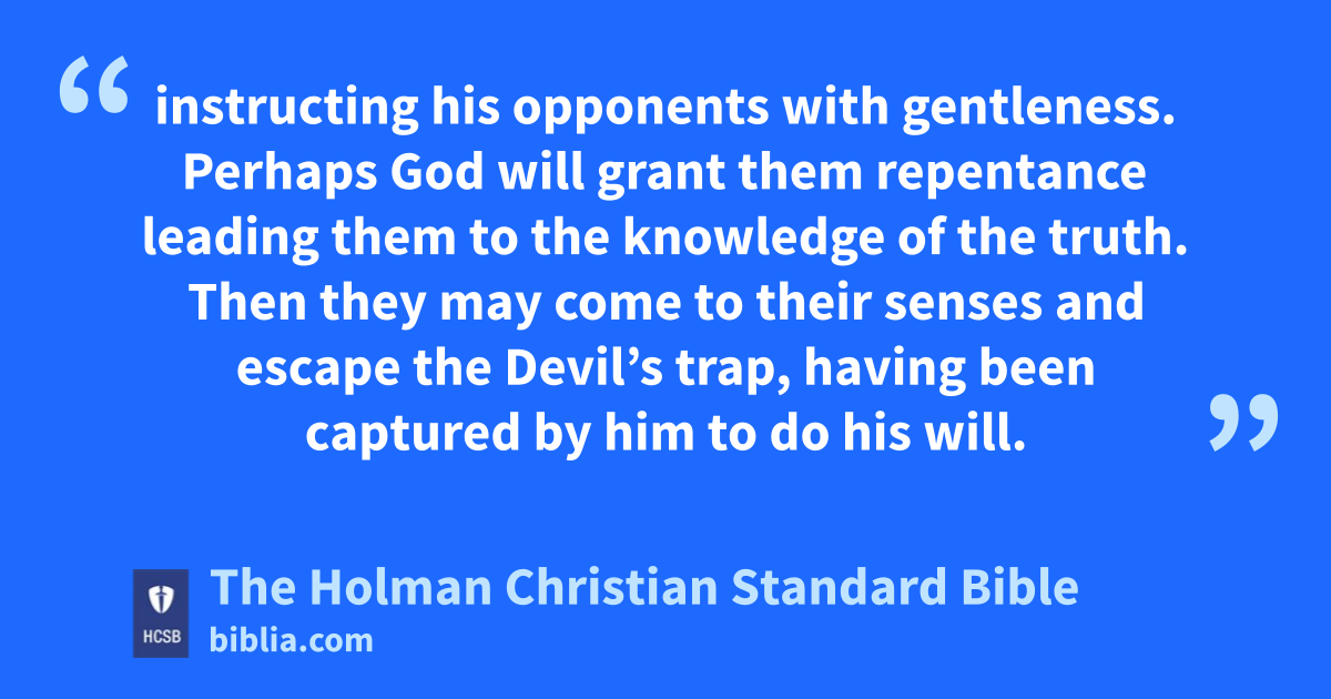 22 Flee u from youthful passions, and pursue righteousness, faith, love, and peace, v along with those who call on the Lord w from a pure heart. 23 But reject foolish and ignorant disputes, knowing that they breed quarrels. 24 The Lord’s x * slave must not quarrel, y but must be gentle to everyone, able to teach, z and patient, 25 instructing his opponents with gentleness. a Perhaps God will grant them repentance b leading them to the knowledge of the truth. 26 Then they may come to their senses and escape the Devil’s trap, c having been captured by him to do his will. d