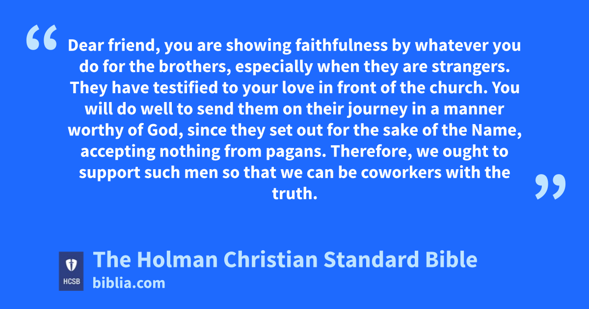5 Dear friend, k you are showing faithfulness l by whatever you do for the brothers, especially when they are strangers. 6 They have testified to your love in front of the church. m You will do well to send them on their journey n in a manner worthy of God, o 7 since they set out for the sake of the Name, p accepting nothing from pagans. q 8 Therefore, we ought to support such men so that we can be coworkers with r the truth.