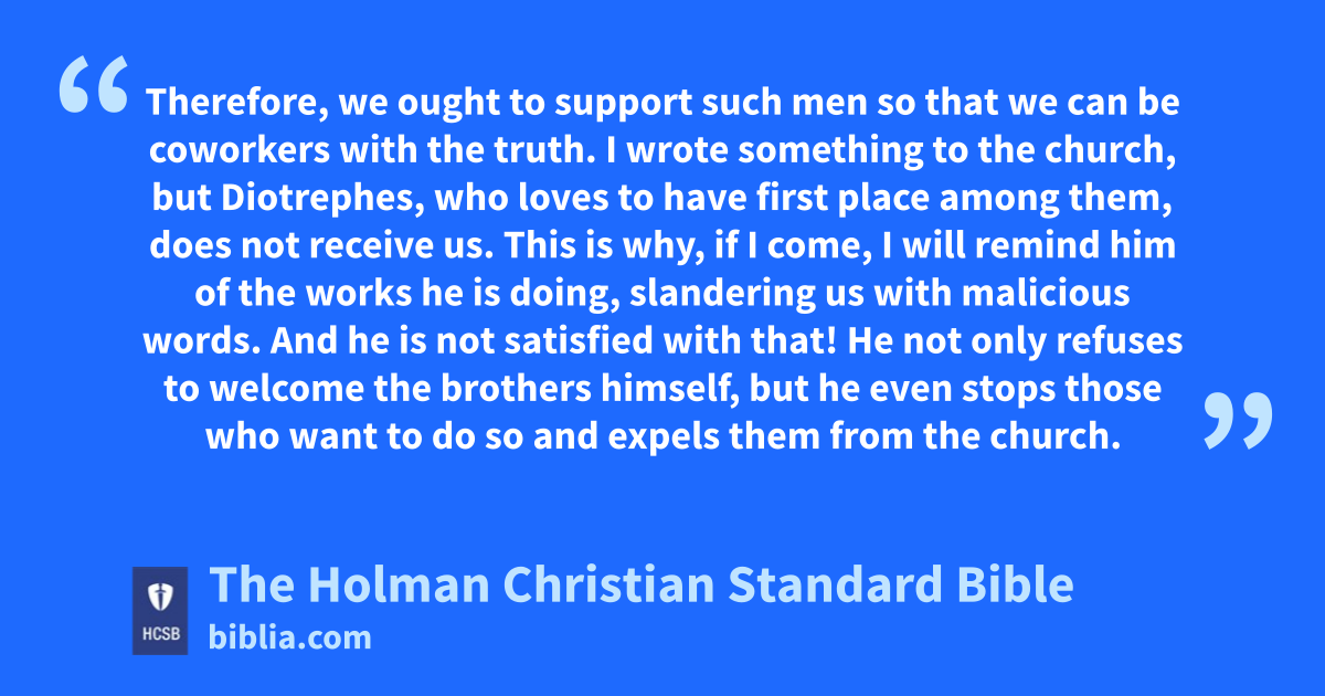 9 I wrote something to the church, but Diotrephes, who loves to have first place among them, s does not receive us. t 10 This is why, if I come, I will remind him of the works he is doing, slandering u us with malicious words. And he is not satisfied with that! He not only refuses to welcome the brothers himself, but he even stops those who want to do so and expels them from the church.