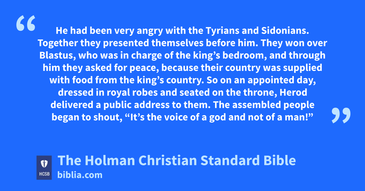 20 He had been very angry with the Tyrians and Sidonians. w Together they presented themselves before him. They won over Blastus, who was in charge of the king’s bedroom, and through him they asked for peace, because their country was supplied with food from the king’s country. x 21 So on an appointed day, dressed in royal robes and seated on the throne, Herod delivered a public address to them. 22 The assembled people began to shout, “It’s the voice of a god and not of a man!” 23 At once an angel of the Lord y struck him because he did not give the glory to God, and he became infected with worms and died. z 24 Then God’s message flourished and multiplied. a 25 After they had completed their relief mission, Barnabas and Saul returned to b Jerusalem, taking along John who is called Mark. c