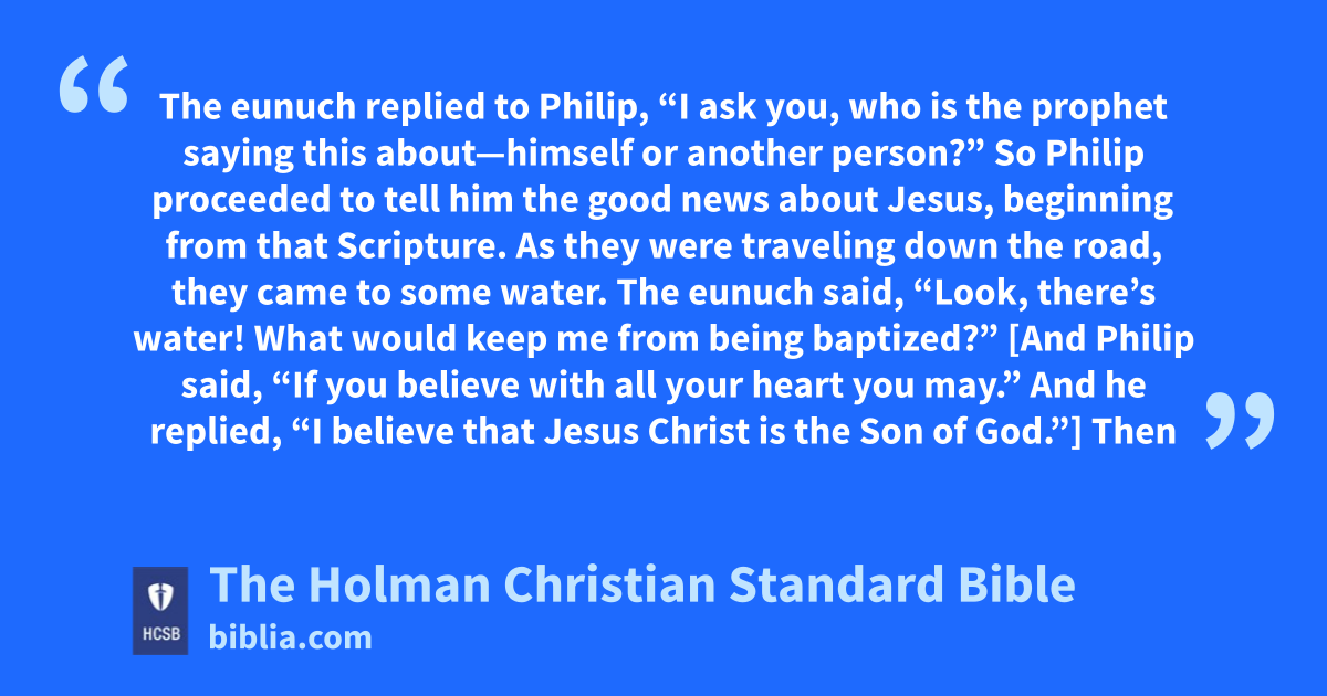 34 The eunuch replied to Philip, “I ask you, who is the prophet saying this about—himself or another person?” 35 So Philip proceeded s to tell him the good news about Jesus, beginning from that Scripture. t