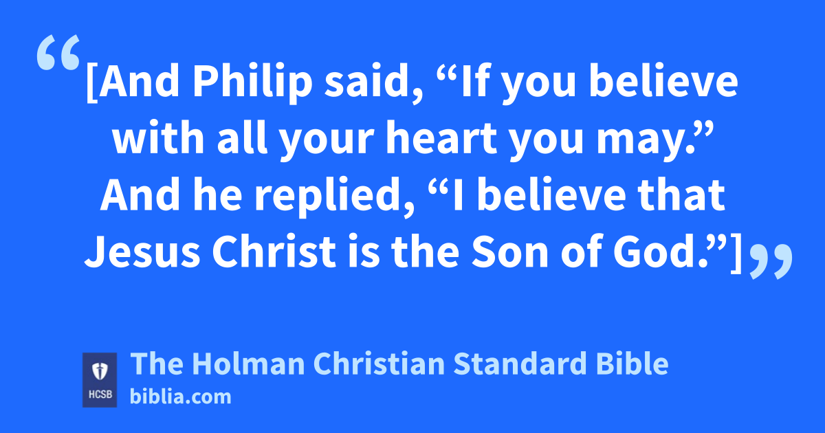 36 As they were traveling down the road, they came to some water. The eunuch said, “Look, there’s water! What would keep me from being baptized?” [37 And Philip said, “If you believe with all your heart you may.” And he replied, “I believe that Jesus Christ is the Son of God.”] u 38 Then he ordered the chariot to stop, and both Philip and the eunuch went down into the water, and he baptized him. 39 When they came up out of the water, the Spirit of the Lord v carried Philip away, and the eunuch did not see him any longer. But he went on his way rejoicing. 40 Philip appeared in w Azotus, x and he was traveling and evangelizing all the towns until he came to Caesarea. y