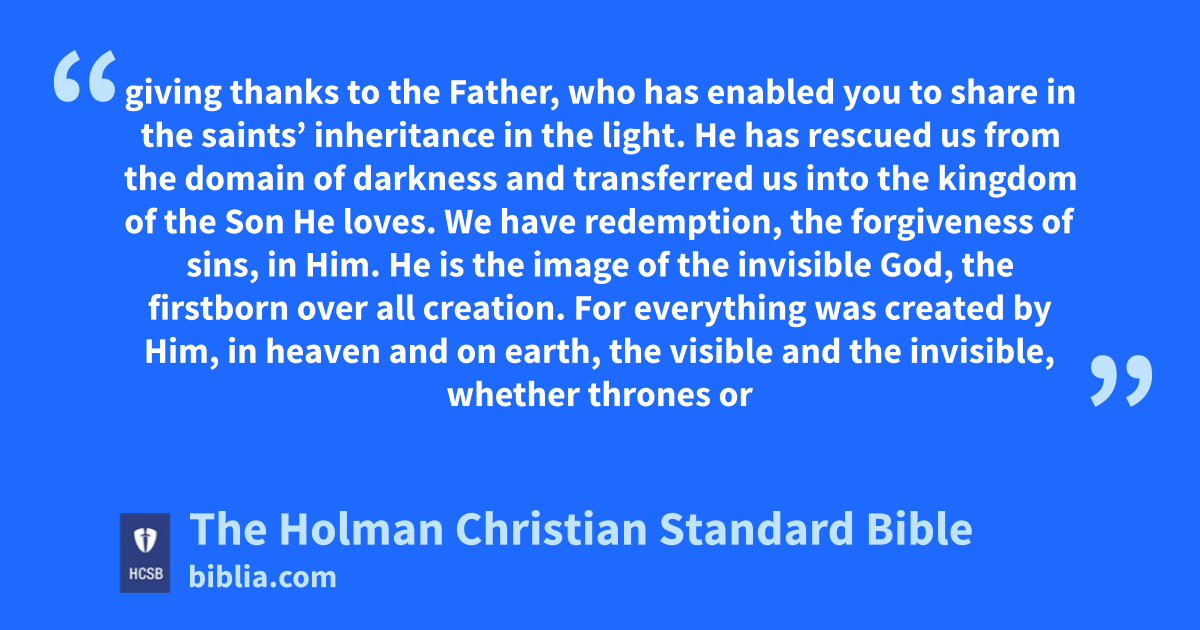 9 For this reason also, since the day we heard this, we haven’t stopped praying for you. We are asking o that you may be filled with the knowledge p of His will q in all wisdom and spiritual understanding, r 10 so that you may * walk worthy of the Lord, fully pleasing to Him, bearing fruit in every good work s and growing in the knowledge of God. t 11 May you be strengthened u with all power, v according to His glorious w might, for all endurance and patience, with joy 12 giving thanks to the Father, who has enabled you x to share in the saints’ y inheritance in the light. z 13 He has rescued a us from the domain of darkness and transferred us into the kingdom b of the Son c He loves. d 14 We have * redemption, e the forgiveness of sins, in Him.