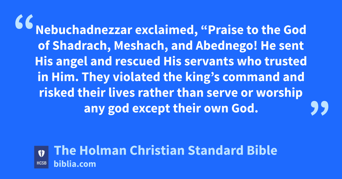 26 Nebuchadnezzar then approached the door of the furnace of blazing fire and called: “Shadrach, Meshach, and Abednego, you servants of the * Most High God—come out!” So Shadrach, Meshach, and Abednego came out of the fire. e 27 When the satraps, prefects, governors, and the king’s advisers gathered around, they saw that the fire had no effect f on g the bodies of these men: not a hair of their heads was singed, their robes were unaffected, and there was no smell of fire on them. h 28 Nebuchadnezzar exclaimed, “Praise to the God of Shadrach, Meshach, and Abednego! He sent His angel i j and rescued His servants who trusted in Him. k They violated the king’s command and risked their lives rather than serve or worship any god except their own God. l 29 Therefore I issue a decree m that anyone of any people, nation, or language n who says anything offensive against the God of Shadrach, Meshach, and Abednego will be torn limb from limb and his house made a garbage dump. o For there is no other god who is able to deliver like this.” 30 Then the king rewarded Shadrach, Meshach, and Abednego in the province of Babylon. p