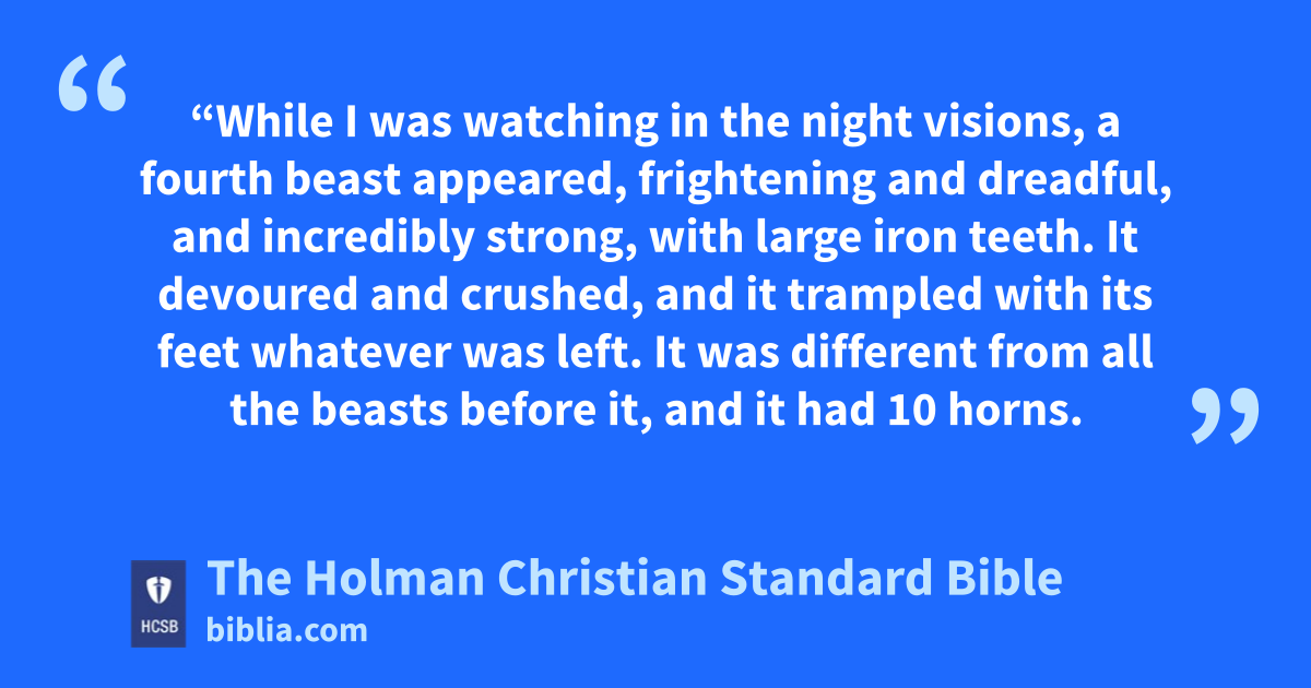 7 “While I was watching in the night visions, a fourth beast m appeared, frightening and dreadful, and incredibly strong, with large iron teeth. It devoured and crushed, and it trampled with its feet whatever was left. It was different from all the beasts before it, and it had 10 horns. n