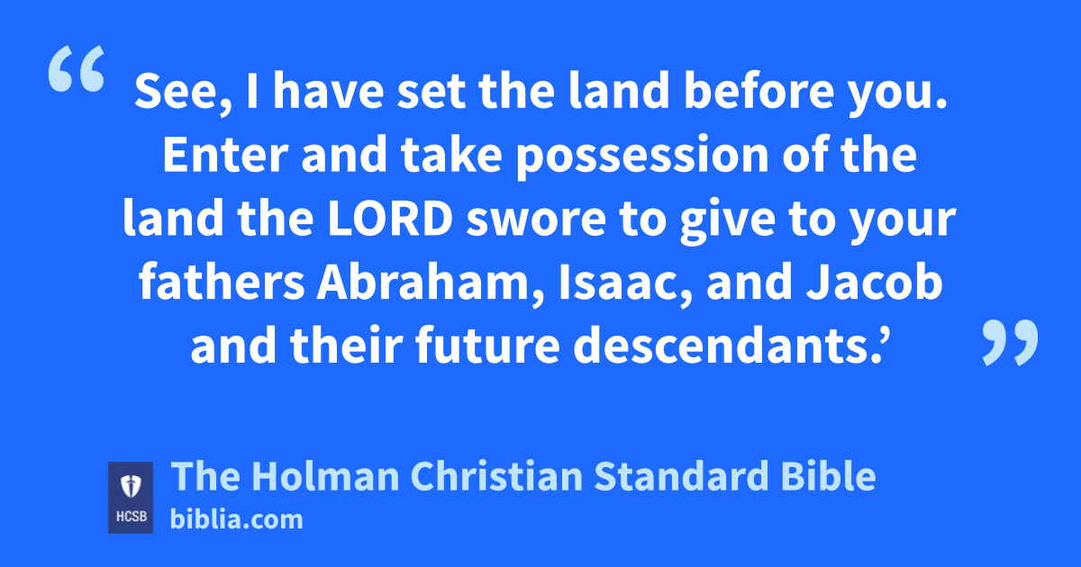 6 “The Lord our God spoke to us at Horeb: ‘You have stayed at this mountain long enough. 7 Resume your journey and go to the hill country of the Amorites k and their neighbors in the Arabah, the hill country, the Judean foothills, l the * Negev m and the sea coast—to the land of the Canaanites and to Lebanon as far as the Euphrates River. n o 8 See, I have set the land before you. Enter and take possession of the land p the Lord swore to give to your fathers q Abraham, Isaac, and Jacob and their future descendants.’ r