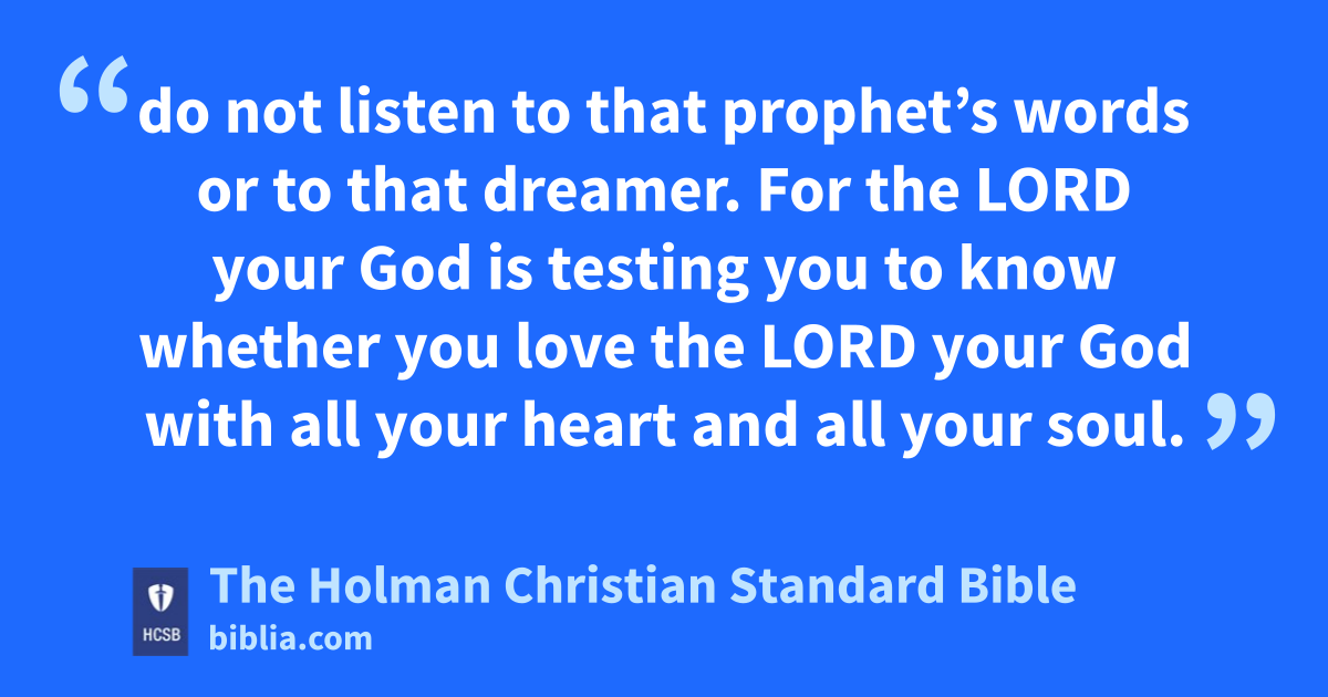 13 “If a prophet or someone who has dreams r arises among you and proclaims a sign or wonder to you, 2 and that sign or wonder he has promised you comes about, but he says, ‘Let us follow other gods,’ which you have not known, ‘and let us worship them,’ 3 do not listen to that prophet’s words or to that dreamer. For the Lord your God is testing you to know whether you love the Lord your God with all your heart and all your soul. s 4 You must follow the Lord your God and * fear Him. You must keep His commands and listen to His voice; you must worship Him and remain faithful t to Him. u 5 That prophet or dreamer must be put to death, v because he has urged rebellion against the Lord your God who brought you out of the land of Egypt and redeemed you from the place of slavery, w to turn you from the way the Lord your God has commanded you to walk. You must purge the evil from you. x