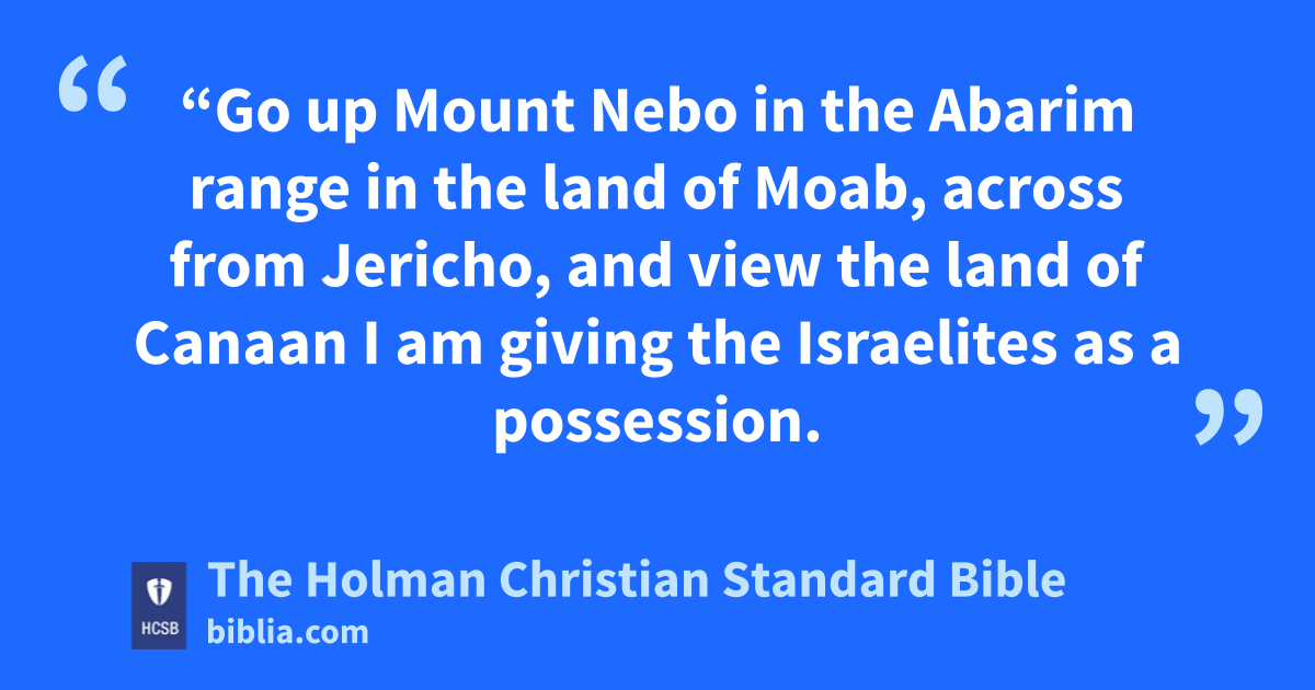 48 On that same day the Lord spoke to Moses, b 49 “Go up Mount Nebo c in the Abarim range in the land of Moab, across from Jericho, and view the land of Canaan I am giving the Israelites as a possession. 50 Then you will die on the mountain that you go up, and you will be gathered to your people, d just as your brother Aaron died on Mount Hor and was gathered to his people. e 51 For both of you broke faith with Me among the Israelites at the waters of Meribath-kadesh in the Wilderness of Zin by failing to treat Me as holy in their presence. 52 Although from a distance you will view the land that I am giving the Israelites, you will not go there.” f