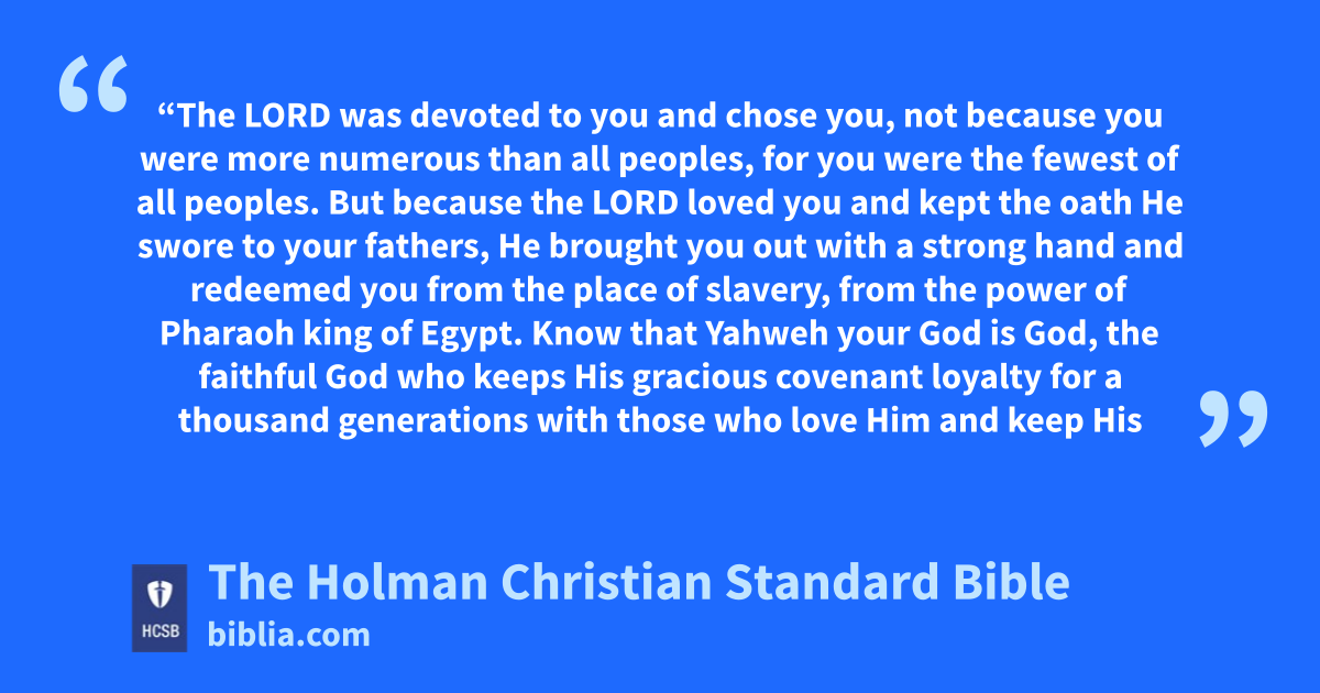 7 “The Lord was devoted to you and chose you, not because you were more numerous than all peoples, for you were the fewest of all peoples. 8 But because the Lord loved j you and kept the oath He swore to your fathers, He brought you out with a strong hand and redeemed k you from the place of slavery, from the power of Pharaoh king of Egypt. 9 Know that * Yahweh your God is God, the faithful God who keeps His gracious covenant loyalty for a thousand generations with those who love Him and keep His commands. l 10 But He directly pays back m and destroys those who hate Him. n He will not hesitate to directly pay back o the one who hates Him. 11 So keep the command—the statutes and ordinances—that I am giving you to follow today.