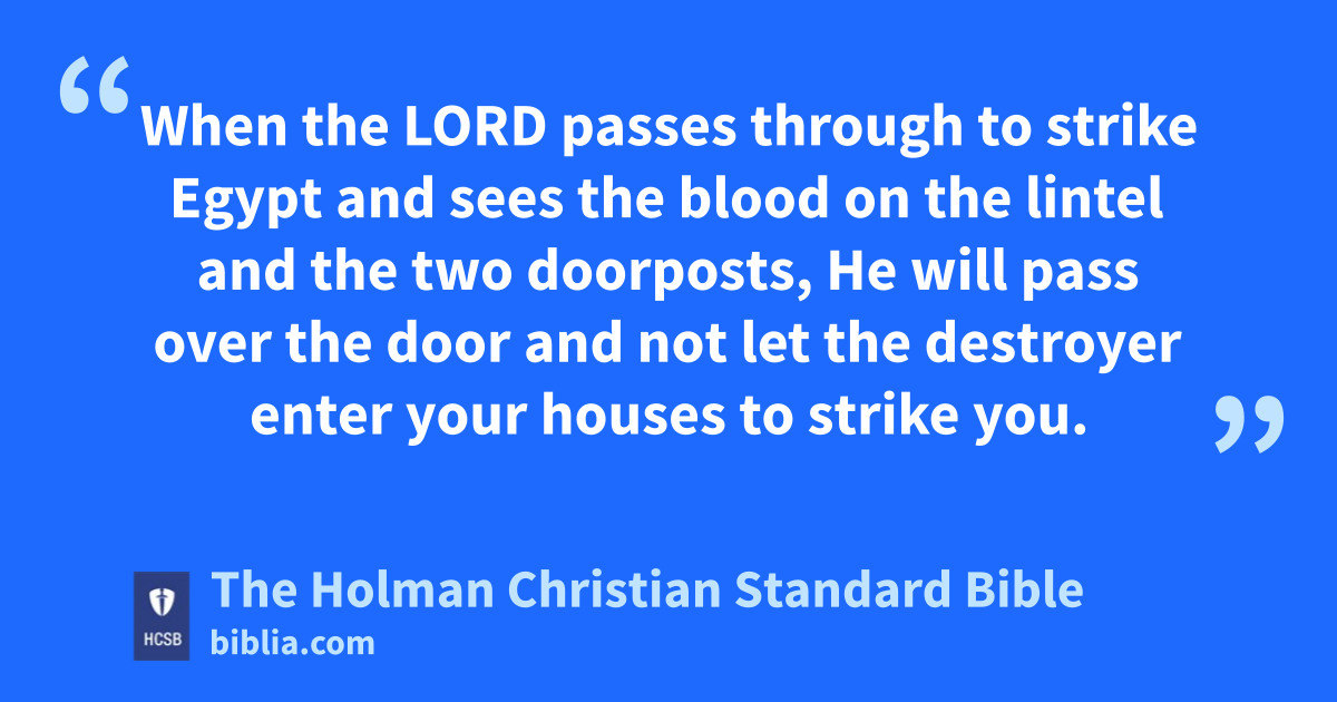21 Then Moses summoned all the elders of Israel and said to them, “Go, select an animal from the flock according to your families, and slaughter the Passover animal. d 22 Take a cluster of hyssop, dip it in the blood e that is in the basin, and brush the lintel and the two doorposts with some of the blood in the basin. None of you may go out the door of his house until morning. 23 When the Lord passes through to strike Egypt and sees the blood on the lintel and the two doorposts, He will pass over the door and not let the destroyer enter your houses to strike you. f
