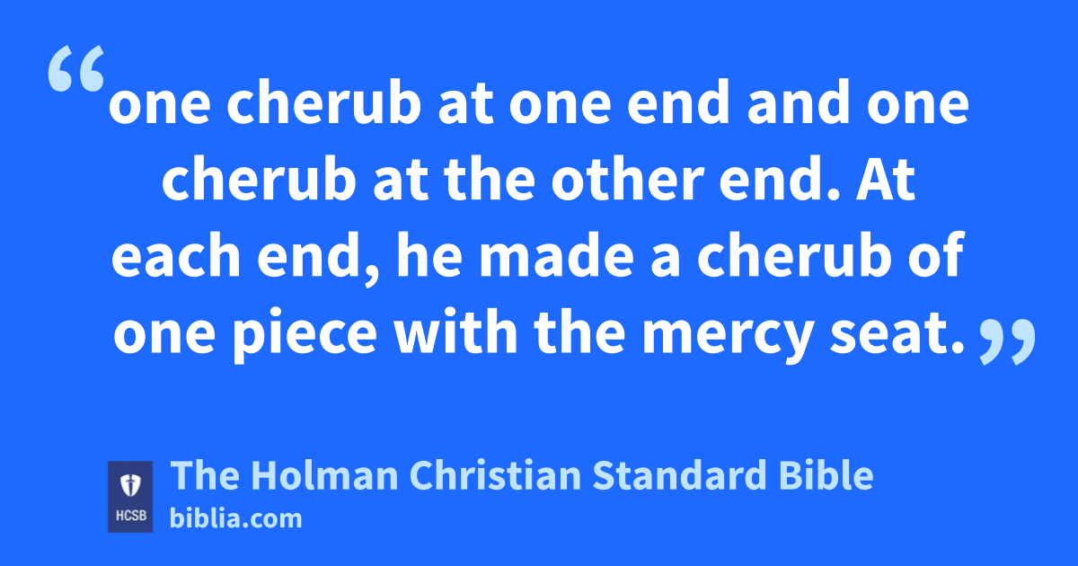 6 He made a * mercy seat of pure gold, 45 inches long and 27 inches wide. t 7 He made two * cherubim of gold; he made them of hammered work at the two ends of the mercy seat, 8 one cherub at one end and one cherub at the other end. At each end, he made a cherub of one piece with the mercy seat. 9 They had wings spread out. They faced each other and covered the mercy seat with their wings. The faces of the cherubim were looking toward the mercy seat.
