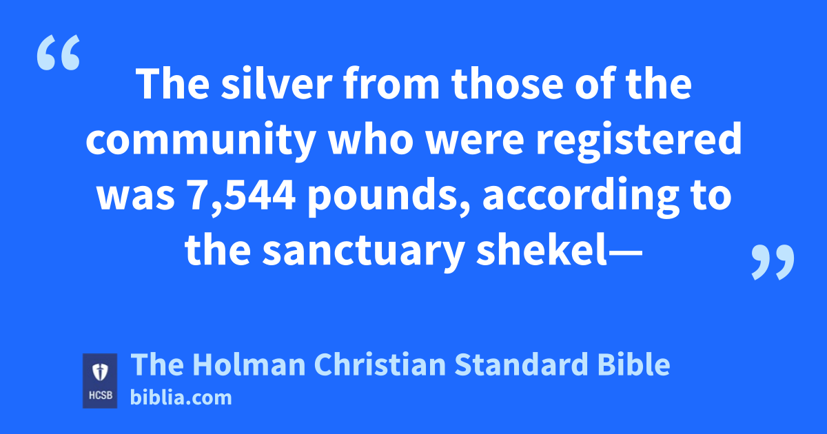 24 All the gold of the presentation offering that was used for the project in all the work on the sanctuary, was 2,193 pounds, c according to the sanctuary * shekel. d 25 The silver from those of the community who were registered was 7,544 pounds, e according to the sanctuary shekel— 26 2/5 of an ounce f per man, that is, half a shekel according to the sanctuary shekel, from everyone 20 years old or more who had crossed over to the registered group, 603,550 men. 27 There were 7,500 pounds g of silver used to cast the bases of the sanctuary and the bases of the veil—100 bases from 7,500 pounds, h 75 pounds i for each base. j 28 With the remaining 44 pounds k he made the hooks for the posts, overlaid their tops, and supplied bands l for them.
