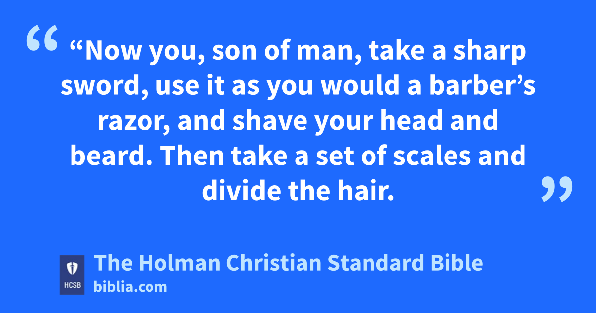 5 “Now you, son of man, take a sharp sword, z use it as you would a barber’s razor, and shave your head and beard. Then take a set of scales and divide the hair. 2 You are to burn up a third of it in the city when the days of the siege have ended; a you are to take a third and slash it with the sword all around the city; and you are to scatter a third to the wind, for I will draw a sword to chase after them. 3 But you are to take a few strands from the hair and secure them in the folds of your robe. b 4 Take some more of them, throw them into the fire, and burn them in it. c A fire will spread from it to the whole house of Israel.