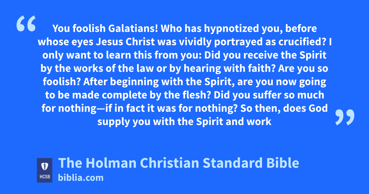 3 You foolish k Galatians! Who has hypnotized you, l before whose eyes Jesus Christ was vividly portrayed m as crucified? n 2 I only want to learn this from you: Did you receive the Spirit by the works of the law or by hearing with faith? o 3 Are you so foolish? After beginning with the Spirit, are you now going to be made complete by the flesh? p 4 Did you suffer q so much for nothing—if in fact it was for nothing? 5 So then, does God supply you with the Spirit and work miracles r among you by the works of the law or by hearing with faith? s