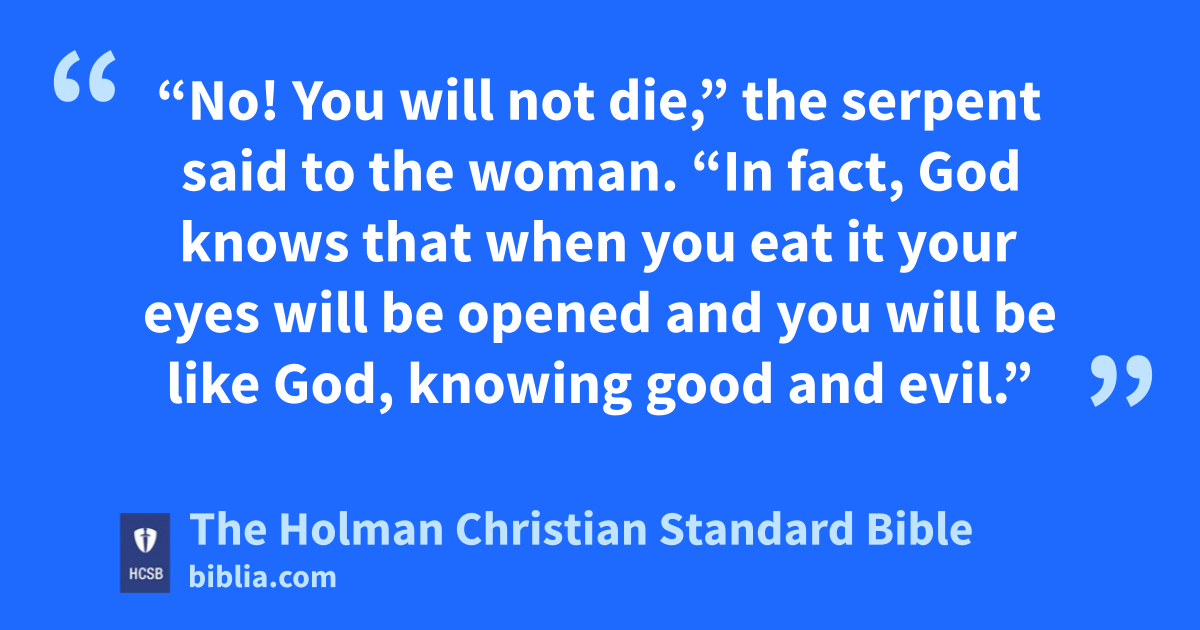 4 “No! You will not die,” the serpent said to the woman. u 5 “In fact, God knows that when v you eat it your eyes will be opened and you will be like God, w knowing good and evil.” 6 Then the woman saw that the tree was good for food and delightful to look at, and that it was desirable for obtaining wisdom. So she took some of its fruit and ate it; she also gave some to her husband, who was with her, and he ate it. x 7 Then the eyes of both of them were opened, and they knew they were naked; so they sewed fig leaves together and made loincloths for themselves.