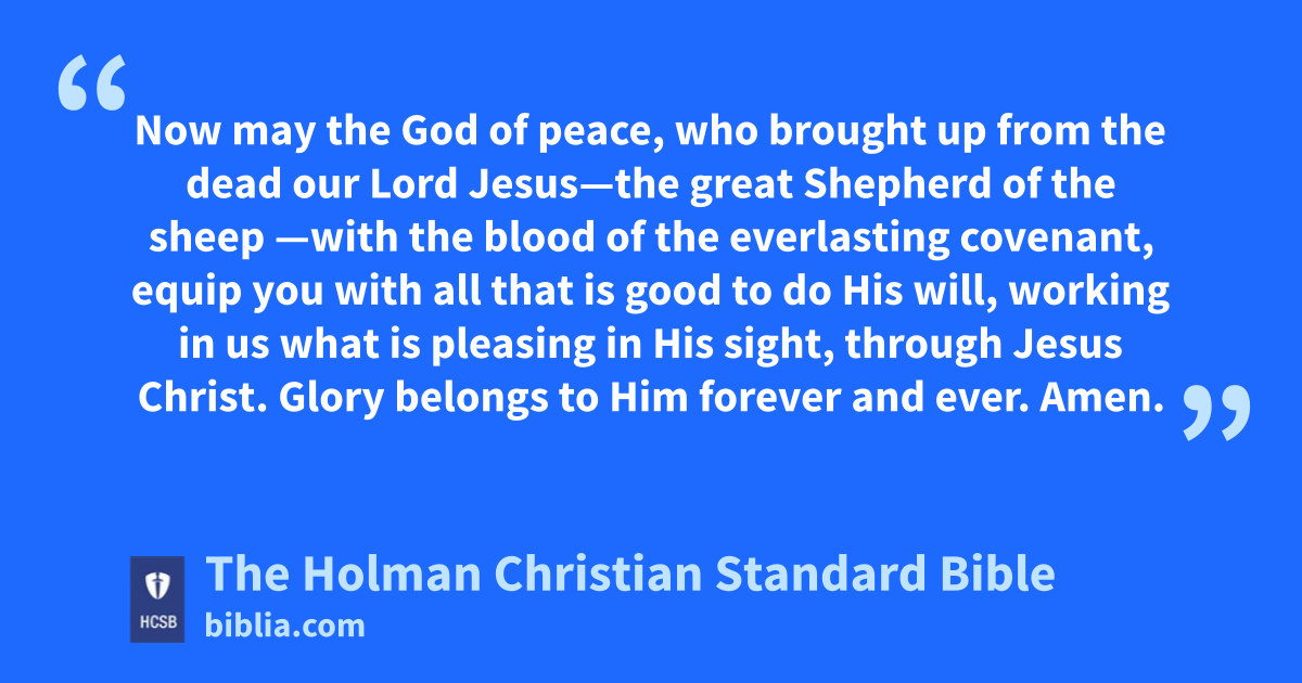 20 Now may the God of peace, who brought up from the dead our Lord Jesus—the great Shepherd of the sheep g—with the blood of the everlasting covenant, h 21 equip i you with all that is good to do His will, working in us what is pleasing in His sight, through Jesus Christ. Glory belongs to Him forever and ever. j k * Amen.