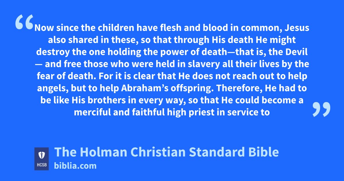 14 Now since the children have flesh and blood in common, Jesus also shared in these, so that through His death He might destroy the one holding the power of death—that is, the Devil l— 15 and free those who were held in slavery all their lives by the fear of death. m 16 For it is clear that He does not reach out to help angels, but to help Abraham’s offspring. n 17 Therefore, He had to be like His brothers in every way, so that He could become a merciful and faithful high priest in service o to God, to make * propitiation p for the sins of the people. q 18 For since He Himself was tested and has suffered, He is able to help those who are tested.