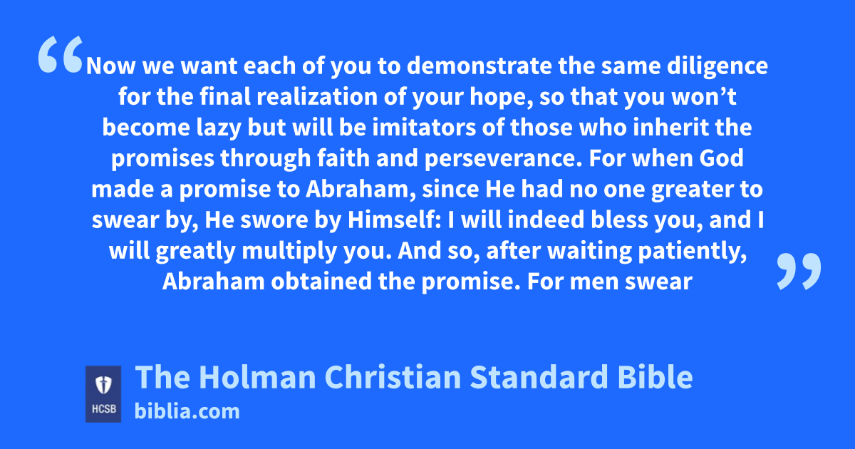 9 Even though we are speaking this way, dear friends, in your case we are confident of the better things connected with salvation. 10 For God is not unjust; He will not forget your work and the love y you showed for His name when you served the * saints—and you continue to serve them. z 11 Now we want each of you to demonstrate the same diligence for the final realization of your hope, 12 so that you won’t become lazy but will be imitators of those who inherit the promises through faith and perseverance. a
