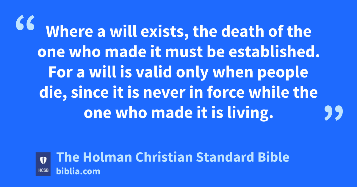 15 Therefore, He is the mediator t of a new covenant, u v so that those who are called might receive the promise w of the eternal inheritance, because a death has taken place for redemption from the transgressions committed under the first covenant. x 16 Where a will exists, the death of the one who made it must be established. 17 For a will is valid only when people die, since it is never in force while the one who made it is living. 18 That is why even the first covenant was inaugurated with blood. 19 For when every command had been proclaimed by Moses to all the people according to the law, he took the blood of calves and goats, along with water, scarlet wool, and hyssop, and sprinkled the scroll itself and all the people, y 20 saying, This is the blood of the covenant that God has commanded for you. z a 21 In the same way, he sprinkled the tabernacle and all the articles of worship with blood. b 22 According to the law almost everything is purified with blood, and without the shedding of blood there is no forgiveness. c