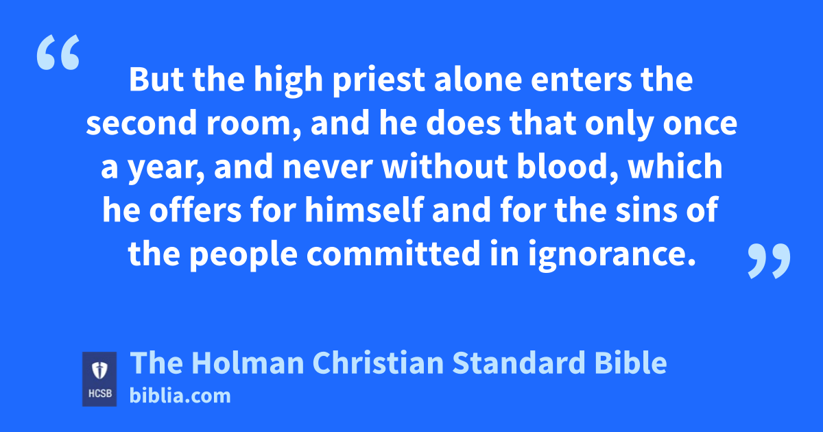 6 With these things set up this way, the priests enter the first room repeatedly, performing their ministry. h 7 But the high priest alone enters the second room, and he does that only once a year, and never without blood, which he offers for himself and for the sins of the people committed in ignorance. i 8 The Holy Spirit was making it clear that the way into the most holy place had not yet been disclosed while the first tabernacle was still standing. j 9 This is a symbol for the present time, during which gifts and sacrifices are offered that cannot perfect the worshiper’s conscience. k 10 They are physical regulations and only deal with food, drink, and various washings imposed until the time of restoration. l