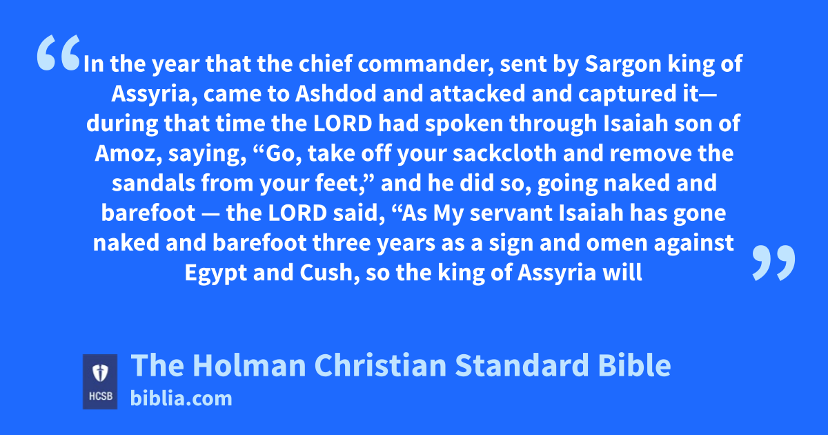 20 In the year that the chief commander, x sent by Sargon king of Assyria, came to Ashdod y and attacked and captured it— 2 during that time the Lord had spoken through Isaiah z son of Amoz, saying, “Go, take off your * sackcloth a and remove the sandals from your feet,” and he did so, going naked and barefoot b— 3 the Lord said, “As My servant Isaiah has gone naked and barefoot three years as a sign and omen against Egypt and * Cush, c 4 so the king of Assyria will lead the captives of Egypt d and the exiles of Cush, young and old alike, naked and barefoot, with bared buttocks—to Egypt’s shame. 5 Those who made Cush their hope and Egypt their boast will be dismayed and ashamed. e 6 And the inhabitants of this coastland will say on that day, ‘Look, this is what has happened to those we relied on and fled to for help to rescue us from the king of Assyria! Now, how will we escape?’ ”