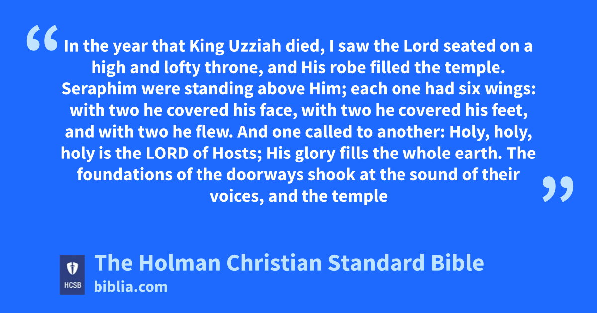 6 In the year that King Uzziah p died, I saw the Lord q seated on a high and lofty r throne, s and His robe t filled the temple. 2 Seraphim u were standing above Him; each one had six wings: v with two he covered his face, with two he covered his feet, and with two he flew. w 3 And one called to another: