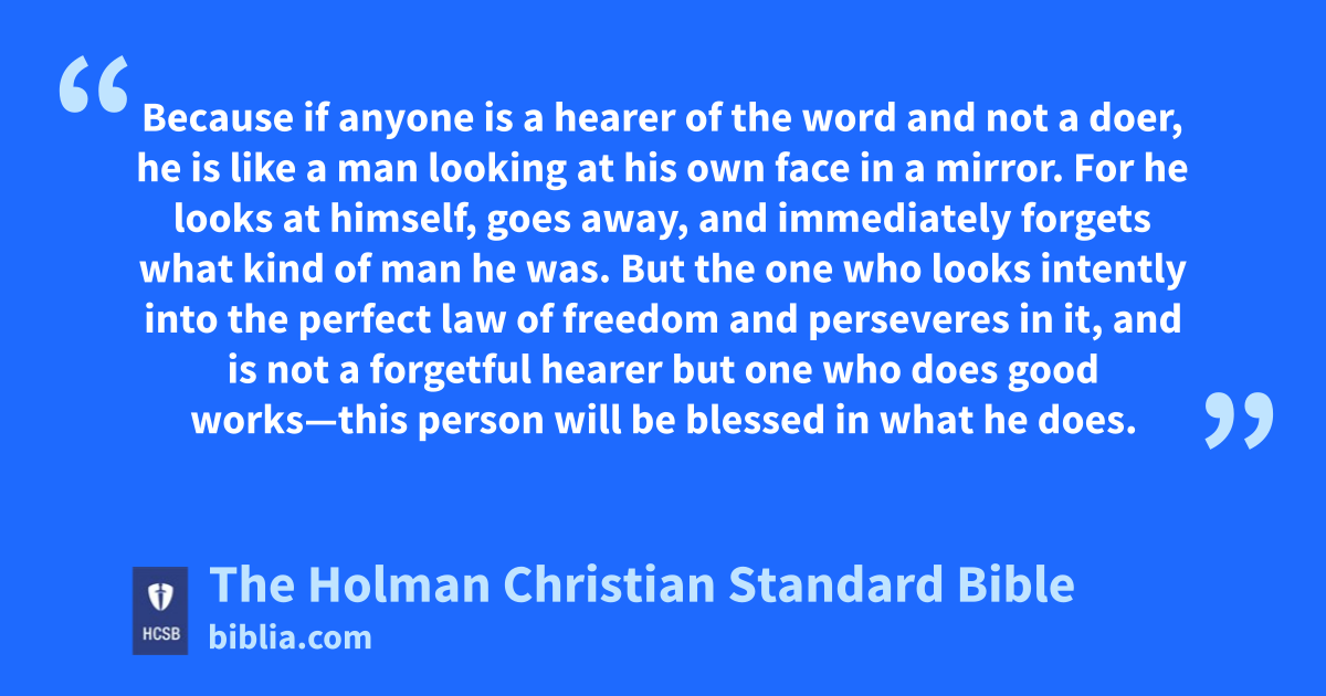 22 But b be doers of the word and not hearers only, deceiving yourselves. 23 Because if anyone is a hearer of the word and not a doer, he is like a man looking at his own face c in a mirror. 24 For he looks at himself, goes away, and immediately forgets what kind of man he was. 25 But the one who looks intently into the perfect law of freedom and perseveres in it, and is not a forgetful hearer but one who does good works—this person will be blessed in what he does. d