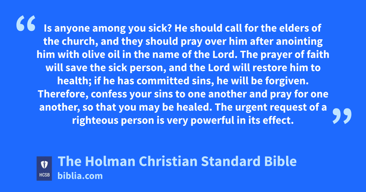 13 Is anyone among you suffering? He should pray. Is anyone cheerful? He should sing praises. n 14 Is anyone among you sick? He should call for the elders of the church, and they should pray over him after anointing him with olive oil in the name of the Lord. o 15 The prayer of faith will save the sick person, and the Lord will restore him to health; if he has committed sins, he will be forgiven. p 16 Therefore, confess your sins to one another and pray for one another, so that you may be healed. The urgent request of a righteous person is very powerful in its effect. q 17 Elijah was a man with a nature like ours; yet he prayed earnestly that it would not rain, and for three years and six months it did not rain on the land. r 18 Then he prayed again, and the sky gave rain and the land produced its fruit. s