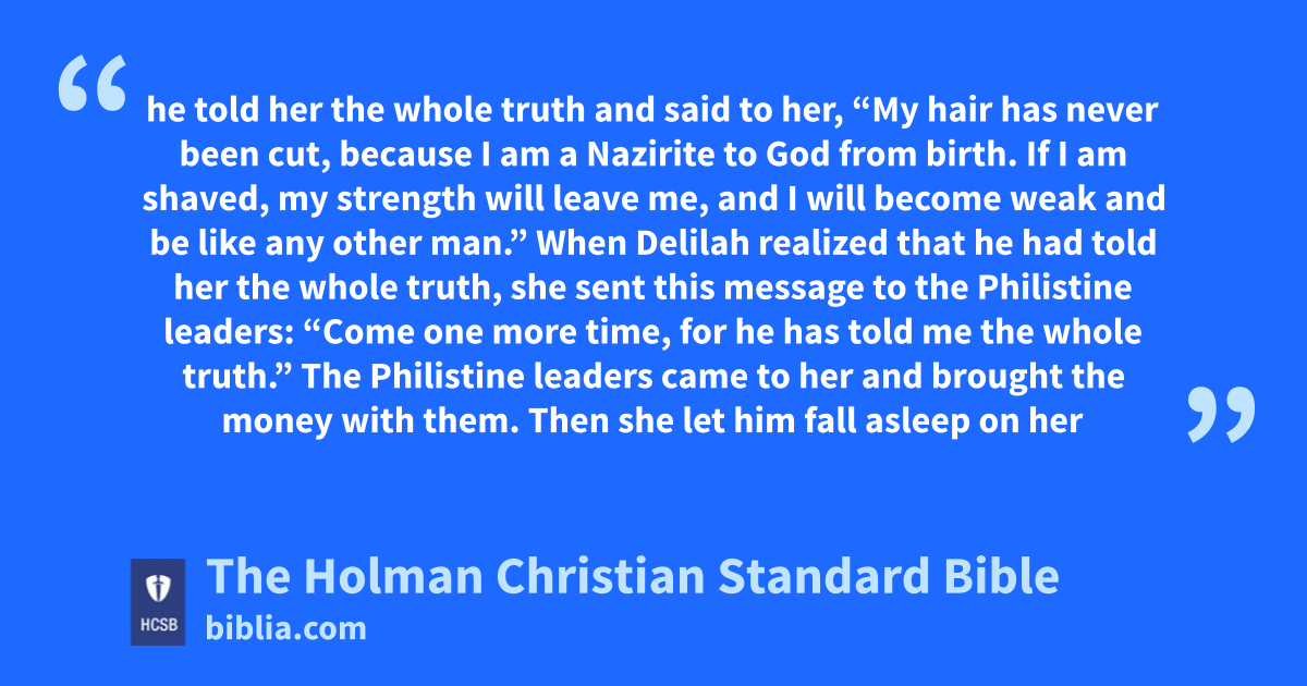 18 When Delilah realized that he had told her the whole truth, she sent this message to the Philistine leaders: “Come one more time, for he has told me the whole truth.” The Philistine leaders came to her and brought the money with them.