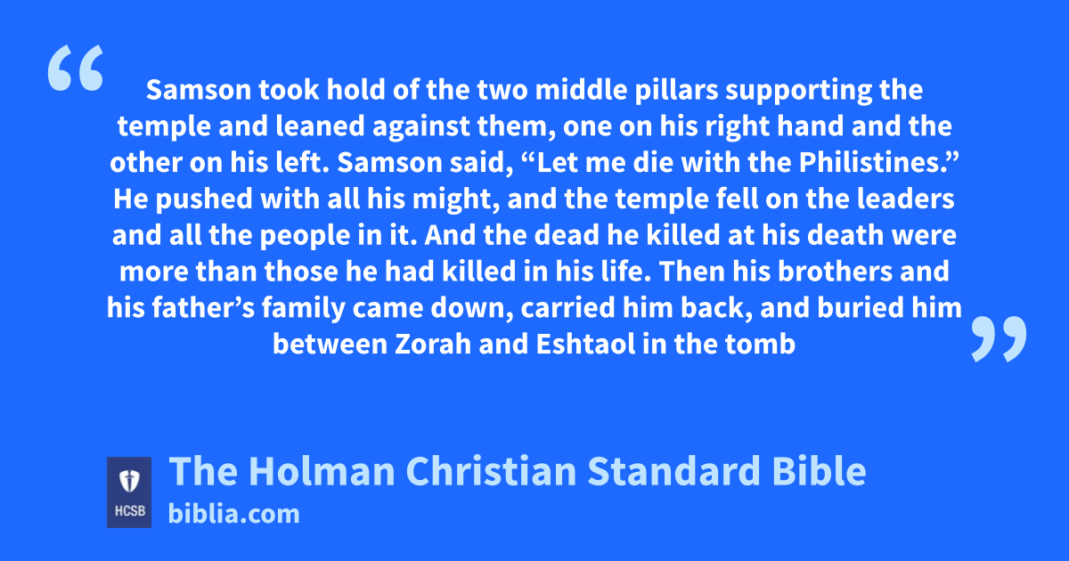 26 Samson said to the young man who was leading him by the hand, “Lead me where I can feel the pillars supporting the temple, so I can lean against them.” 27 The temple was full of men and women; all the leaders of the Philistines were there, and about 3,000 men and women were on the roof watching Samson entertain them. 28 He called out to the Lord: “Lord God, please remember me. s Strengthen me, God, just once more. With one act of vengeance, let me pay back the Philistines for my two eyes.” 29 Samson took hold of the two middle pillars supporting the temple and leaned against them, one on his right hand and the other on his left. 30 Samson said, “Let me die with the Philistines.” He pushed with all his might, and the temple fell on the leaders and all the people in it. And the dead he killed at his death were more than those he had killed in his life.
