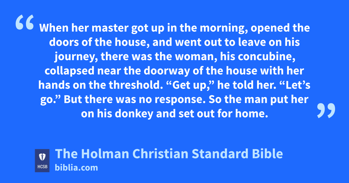 27 When her master got up in the morning, opened the doors of the house, and went out to leave on his journey, there was the woman, his concubine, collapsed near the doorway of the house with her hands on the threshold. 28 “Get up,” he told her. “Let’s go.” But there was no response. x So the man put her on his donkey and set out for home.
