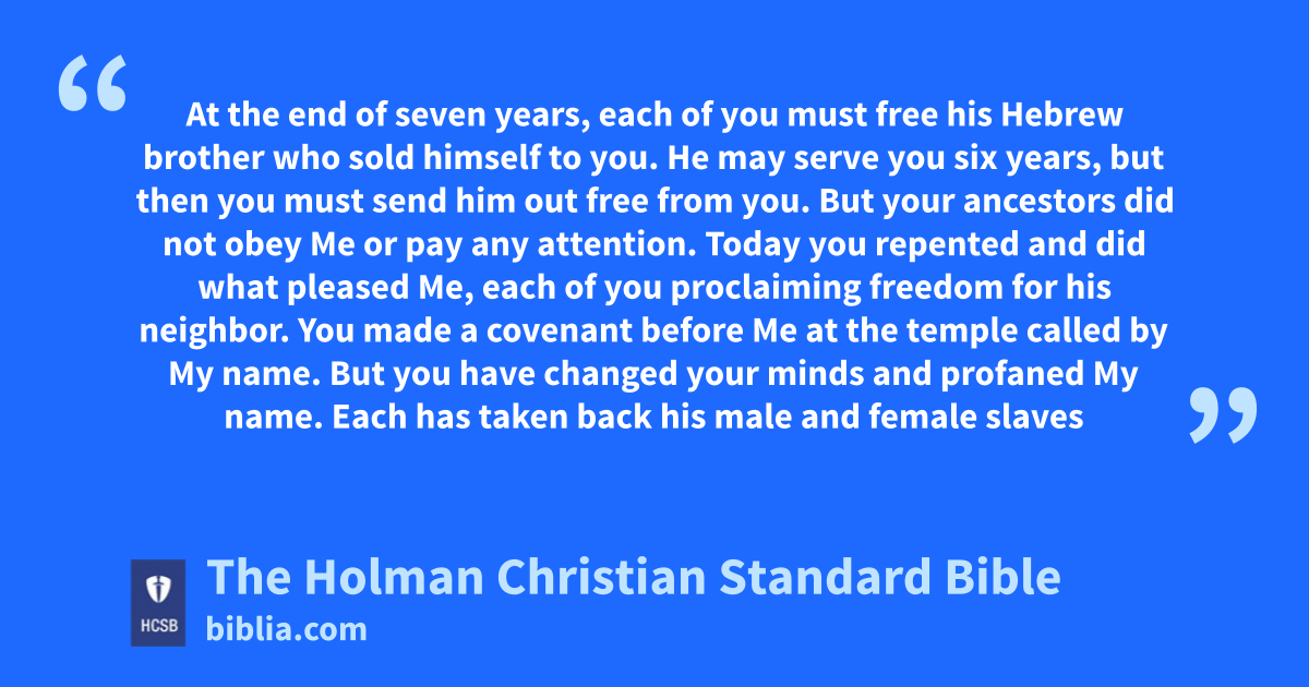12 Then the word of the Lord came to Jeremiah from the Lord: 13 “This is what the Lord, the God of Israel, says: I made a covenant z with your ancestors when I brought them out of the land of Egypt, out of the place of slavery, saying: 14 At the end of seven years, each of you must free his Hebrew brother who sold himself a to you. He may serve you six years, but then you must send him out free from you. b But your ancestors did not obey Me or pay any attention. 15 Today you repented and did what pleased Me, each of you proclaiming freedom for his neighbor. You made a covenant before Me c at the temple called by My name. d 16 But you have changed your minds e and profaned My name. f Each has taken back his male and female slaves who had been freed to go wherever they wanted, and you have again subjugated them to be your slaves.