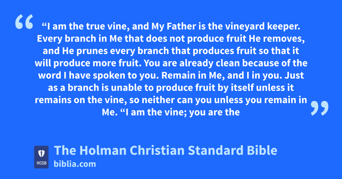15 “I am y the true vine, and My Father is the vineyard keeper. 2 Every branch in Me that does not produce fruit He removes, z and He prunes every branch that produces fruit so that it will produce more fruit. 3 You are already * clean a because of the word I have spoken to you. 4 Remain in Me, and I in you. Just as a branch is unable to produce fruit by itself unless it remains on the vine, so neither can you unless you remain in Me. b