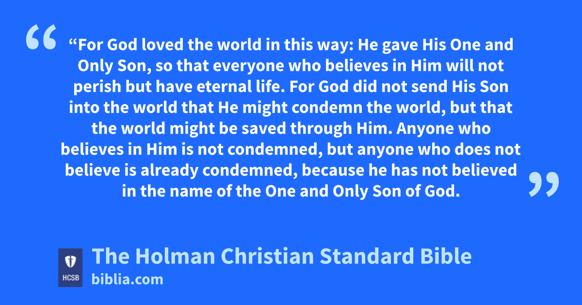 16 “For God loved e the world * in this way: f He gave His * One and Only g Son, h so that everyone who believes in Him will not perish but have eternal life. i 17 For God did not send His Son into the world that He might condemn j the world, but that the world might be saved through Him. 18 Anyone who believes in Him is not condemned, but anyone who does not believe is already condemned, k because he has not believed in the name l of the One and Only Son m of God.