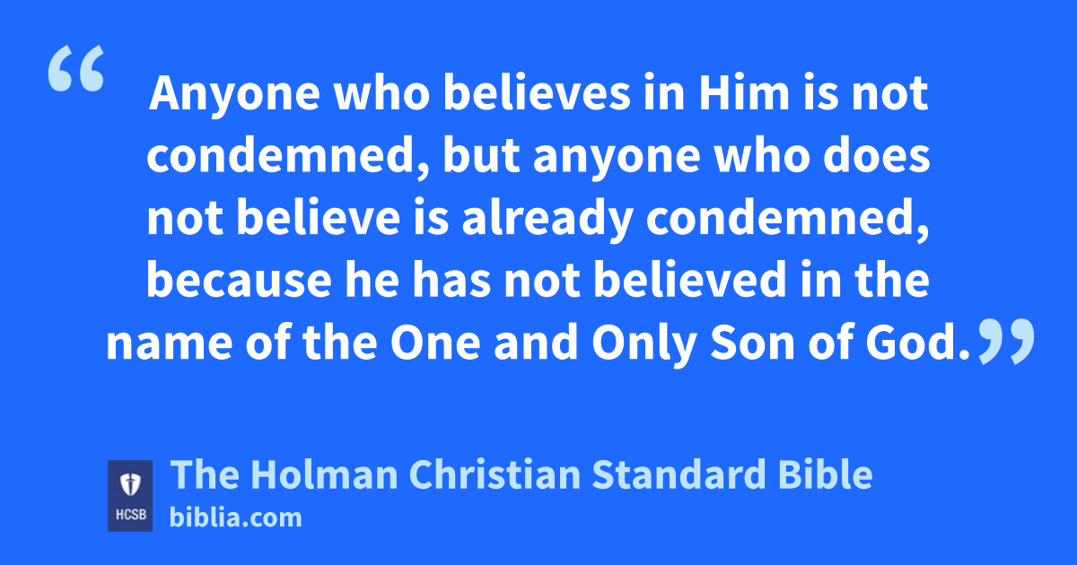 16 “For God loved e the world * in this way: f He gave His * One and Only g Son, h so that everyone who believes in Him will not perish but have eternal life. i 17 For God did not send His Son into the world that He might condemn j the world, but that the world might be saved through Him. 18 Anyone who believes in Him is not condemned, but anyone who does not believe is already condemned, k because he has not believed in the name l of the One and Only Son m of God.
