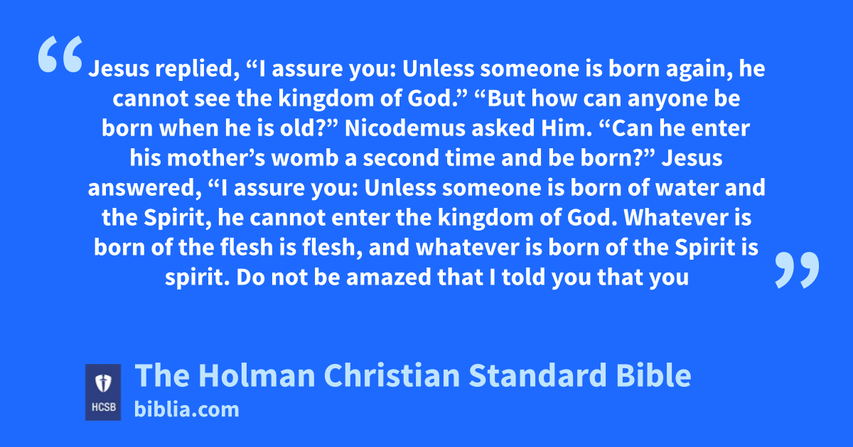 5 Jesus answered, “I assure you: Unless someone is born h of water and the Spirit, i j he cannot enter the kingdom of God. 6 Whatever is born of the flesh k is flesh, and whatever is born of the Spirit l is spirit. 7 Do not be amazed that I told you that you m must be born n again. 8 The wind o blows where it pleases, and you hear its sound, but you don’t know where it comes from or where it is going. p So it is with everyone born of the Spirit.” q