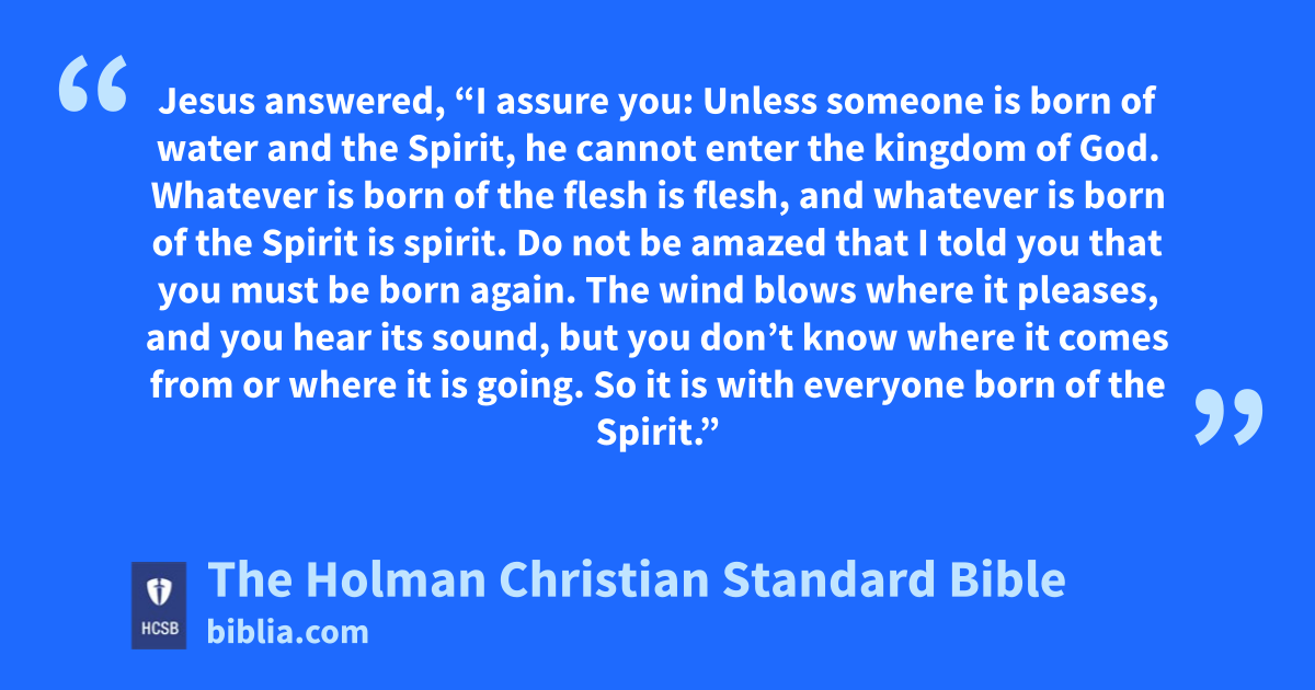5 Jesus answered, “I assure you: Unless someone is born h of water and the Spirit, i j he cannot enter the kingdom of God. 6 Whatever is born of the flesh k is flesh, and whatever is born of the Spirit l is spirit. 7 Do not be amazed that I told you that you m must be born n again. 8 The wind o blows where it pleases, and you hear its sound, but you don’t know where it comes from or where it is going. p So it is with everyone born of the Spirit.” q