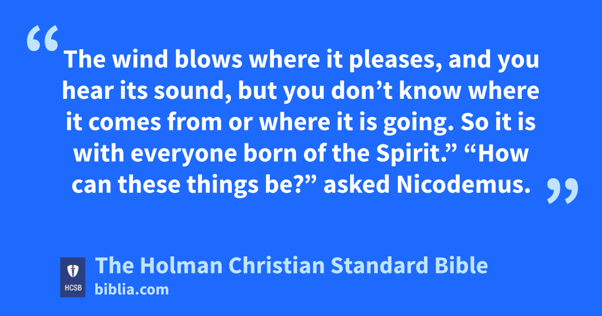 5 Jesus answered, “I assure you: Unless someone is born h of water and the Spirit, i j he cannot enter the kingdom of God. 6 Whatever is born of the flesh k is flesh, and whatever is born of the Spirit l is spirit. 7 Do not be amazed that I told you that you m must be born n again. 8 The wind o blows where it pleases, and you hear its sound, but you don’t know where it comes from or where it is going. p So it is with everyone born of the Spirit.” q