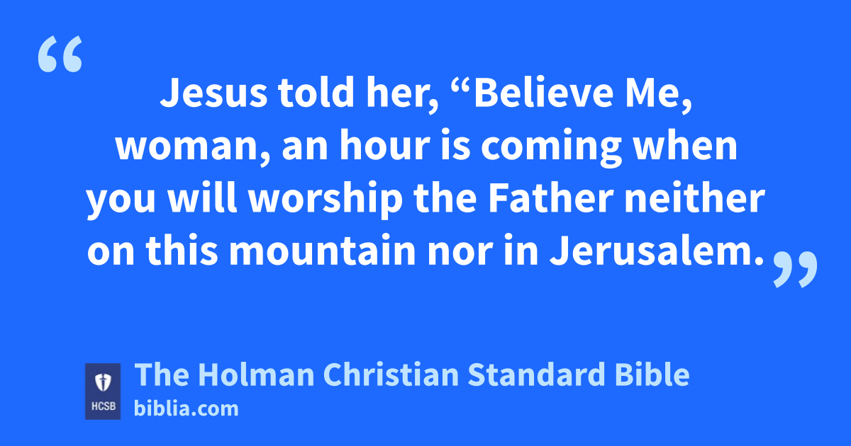 21 Jesus told her, “Believe Me, * woman, an hour is coming when you will worship the Father neither on this mountain nor in Jerusalem. 22 You Samaritans u worship what you do not know. We worship what we do know, because salvation is from the Jews. v 23 But an hour is coming, and is now here, w when the true worshipers will worship the Father in spirit and truth. Yes, the Father wants such people to worship Him. 24 God is spirit, x and those who worship Him must worship in spirit and truth.” y