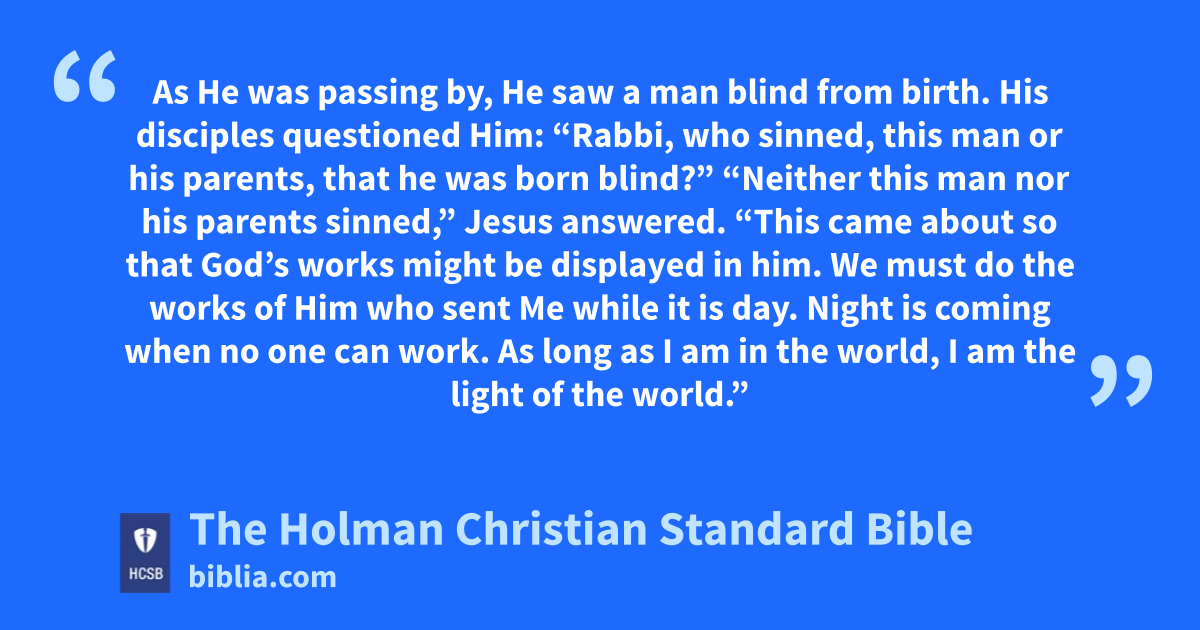 3 “Neither this man nor his parents sinned,” Jesus answered. “This came about so that God’s works z might be displayed in him. 4 We a must do the works b of Him who sent Me c while it is day. d Night is coming when no one can work. 5 As long as I am in the world, I am the light of the world.” e