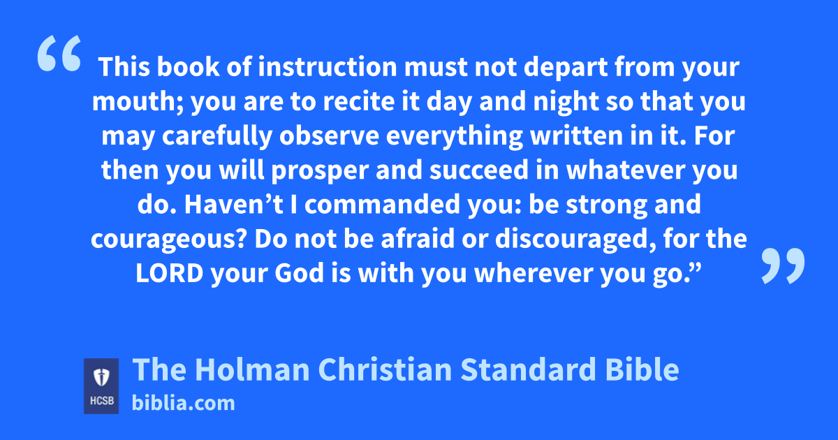 6 “Be strong and courageous, m for you will distribute the land I swore to their fathers to give them as an inheritance. n 7 Above all, be strong and very courageous to carefully observe the whole instruction My servant Moses commanded you. o Do not turn from it to the right or the left, so that you will have success wherever you go. 8 This book of instruction must not depart from your mouth; p you are to recite q it day and night so that you may carefully observe everything written in it. For then you will prosper and succeed in whatever you do. r 9 Haven’t I commanded you: be strong and courageous? s Do not be afraid or discouraged, for the Lord your God is with you wherever you go.”