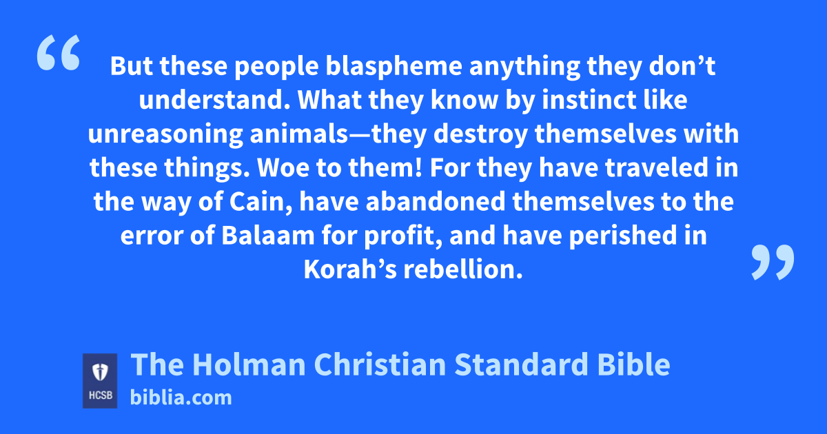 8 Nevertheless, these dreamers likewise defile their flesh, reject authority, and blaspheme glorious ones. u 9 Yet Michael v the archangel, w when he was disputing with the Devil x in a debate about Moses’ y body, did not dare bring an abusive condemnation against him but said, “The Lord rebuke you!” 10 But these people blaspheme anything they don’t understand. What they know by instinct like unreasoning animals—they destroy themselves with these things. 11 Woe to them! For they have traveled in the way of Cain, z have abandoned themselves to the error of Balaam a for profit, and have perished in Korah’s rebellion. b