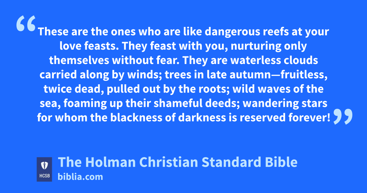 12 These are the ones who are like dangerous reefs c at your love feasts. d They feast with you, nurturing only themselves without fear. They are waterless clouds carried along by winds; e trees in late autumn—fruitless, twice dead, pulled out by the roots; 13 wild waves of the sea, foaming up their shameful deeds; wandering stars f for whom the blackness of darkness g is reserved forever! h