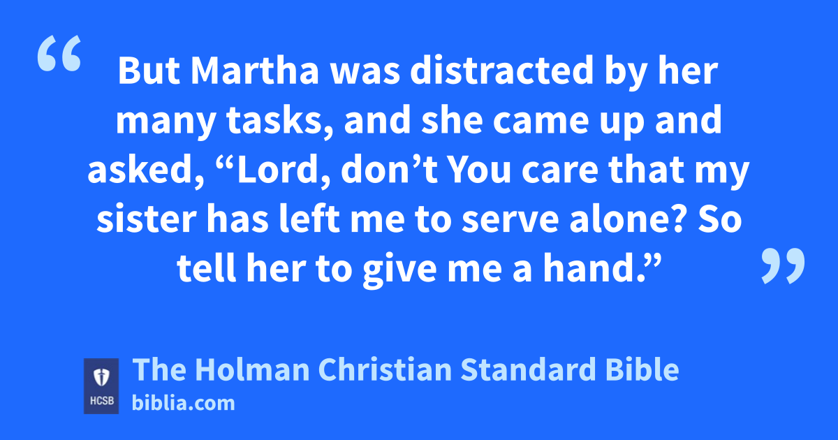 38 While they were traveling, He entered a village, and a woman named Martha a welcomed Him into her home. b 39 She had a sister named Mary, who also sat at the Lord’s c feet d and was listening to what He said. e 40 But Martha was distracted by her many tasks, and she came up and asked, “Lord, don’t You care f that my sister has left me to serve alone? So tell her to give me a hand.” g h